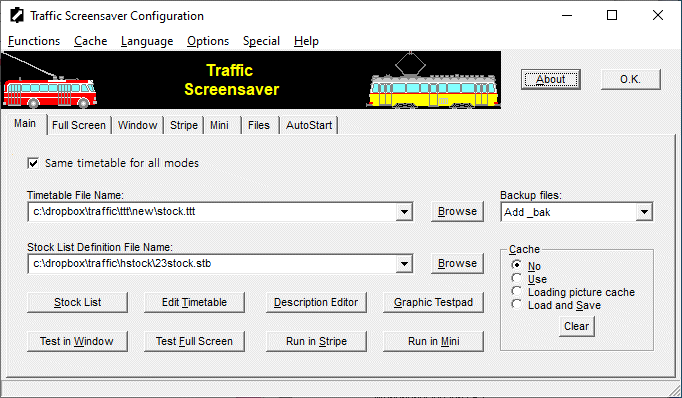 The Configuration Window is the gateway to all of the basic features and functions of the Traffic screensaver. It is the springboard for the user who wishes to create their own Timetable files or who wishes to add his/her own vehicles, or those available as add on modules, to the program. Consequently, the Configuration Window is used to access all of the main editing interfaces of the program.